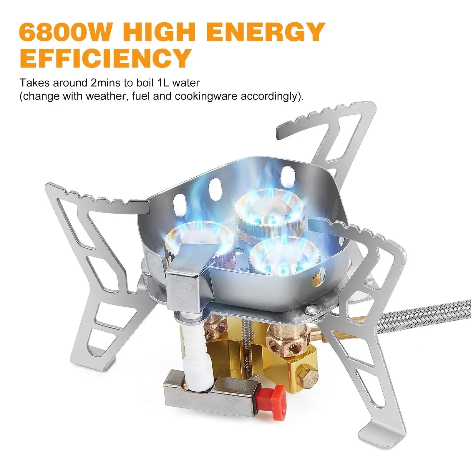 With high power of up to 6800W, the camping stove heats faster, which helps finish cooking in a short time and improve efficiency. It takes less than 2 minutes to boil 1L water. And the windproof design provides an efficient prevention to wind, which helps improve burning efficiency and save gas fuel.